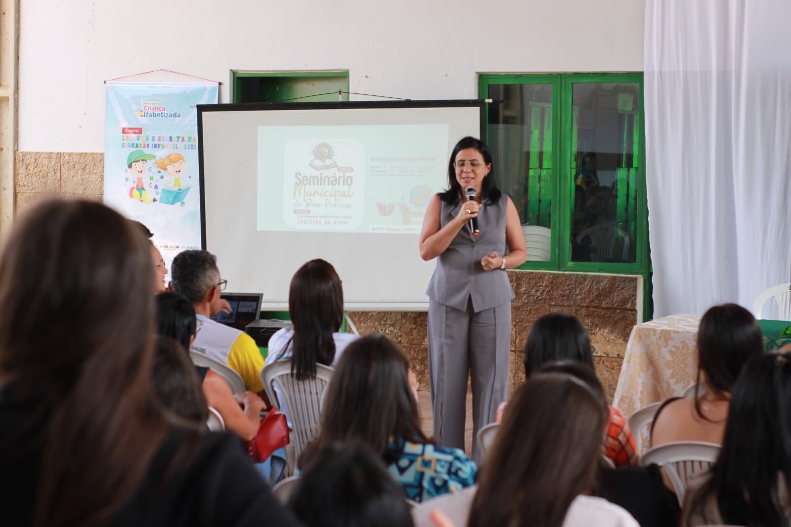 Com o tema “FormAÇÃO: Transformando saberes em boas práticas”, o seminário teve abertura com a apresentação do Hino de Juazeiro, e a apresentação “Viajando no mundo da leitura” com as crianças do CMEI Deusdedith Sotero Gomes.